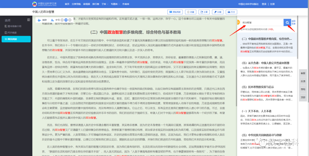 中国社会科学文库V3.1版支持PDF阅读和网页阅读页面文内检索,检索结果可迅速定位至相应位置。