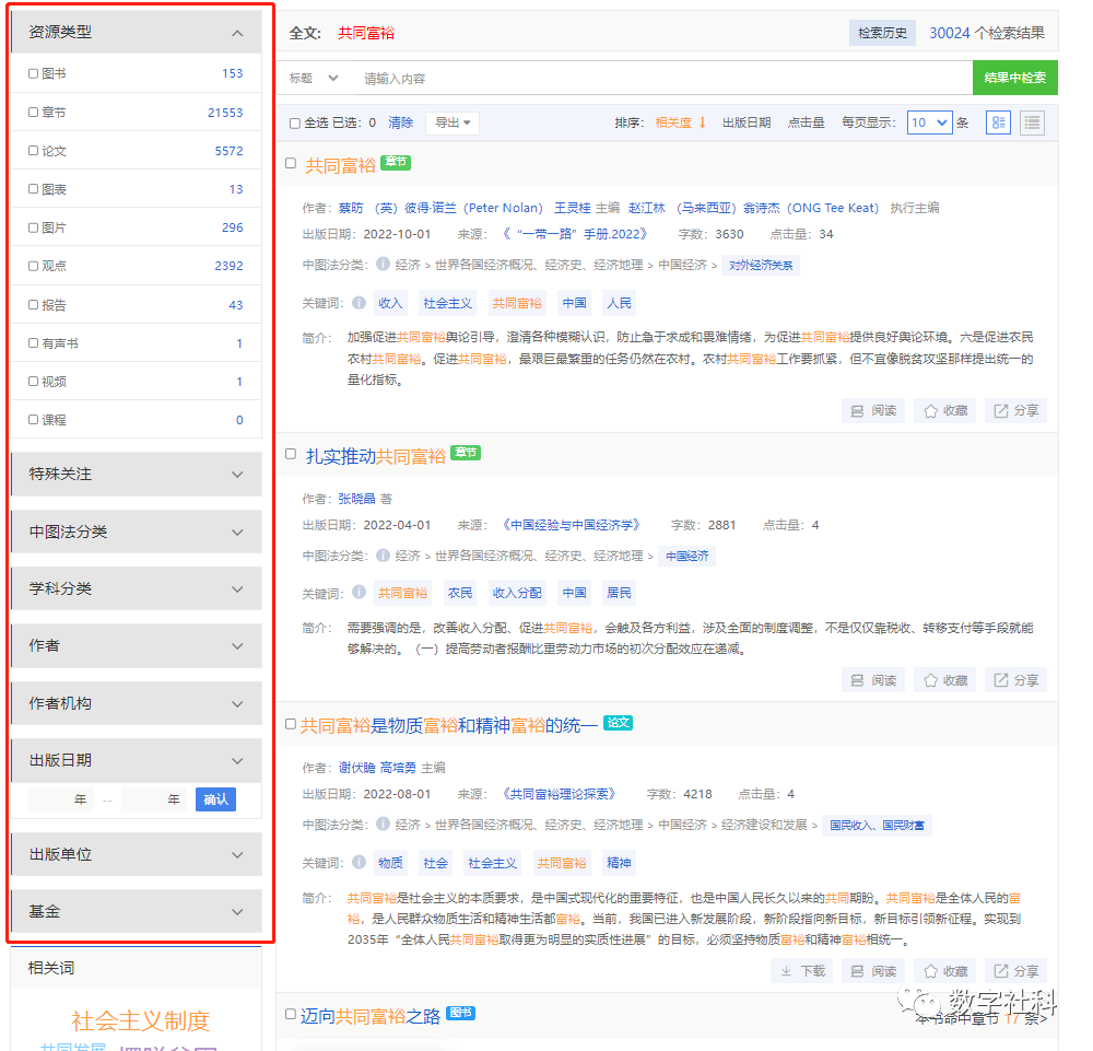 中国社会科学文库V3.1版升级了检索的底层架构,检索结果默认将图书、章节、论文、图片图表、报告、视频、观点等资源类型一并列出,并根据关键词的匹配度从多到少排列。