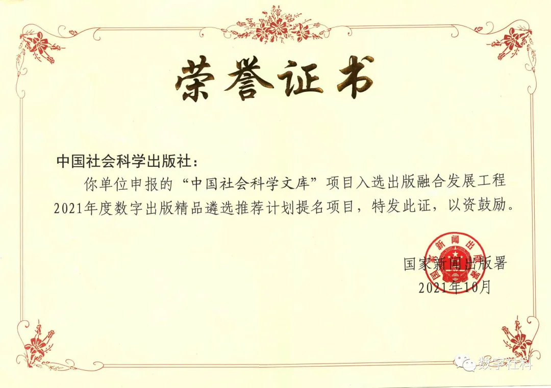 - “中国社会科学文库”获得第十一届中国数字出版博览会2020-2021年度数字出版“优秀品牌”荣誉
