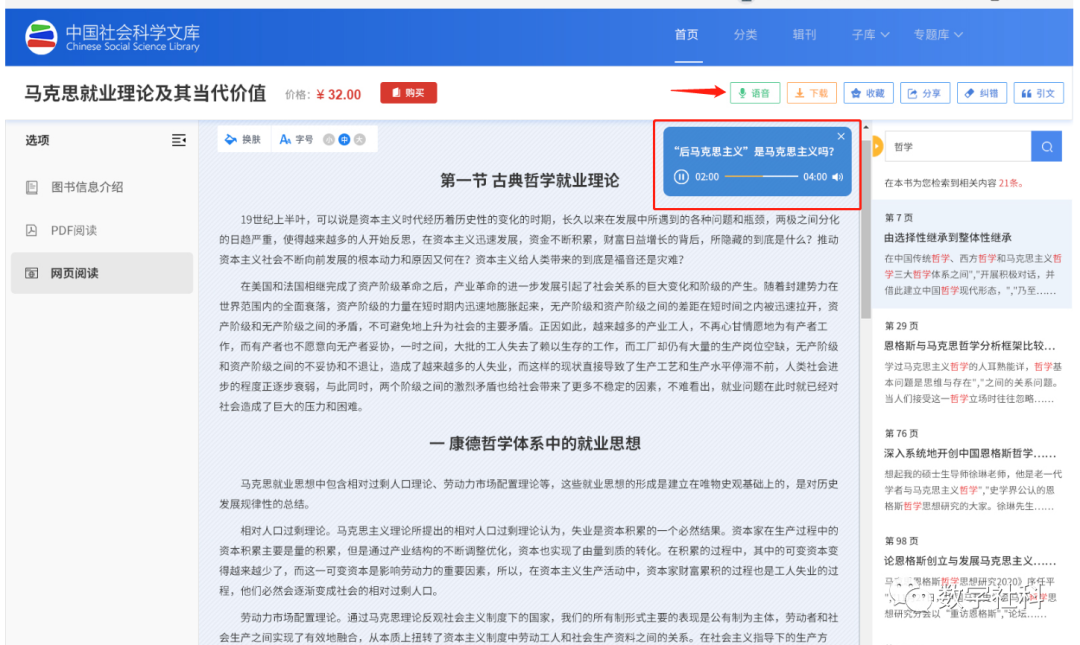 中国社会科学文库V3.1版增加了全书文本语音朗读功能,通过点击正文上方“语音朗读”按钮,即可AI语音朗读正文。