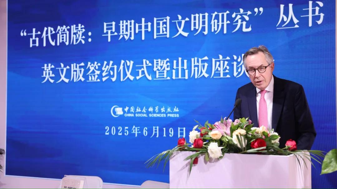 泰勒·弗朗西斯集团全球图书业务总裁贝谨立在致辞中说,非常荣幸能够参与并见证这一历史性时刻。他对赵剑英、朱昌荣和王占仁教授在项目推进中的贡献表示感谢。他表示,自与中国社会科学出版社建立合作以来,双方关系蓬勃发展,已签署200余项出版合同,出版60余种图书,覆盖多个学科领域,极大丰富了中西学术交流。他认为,新签约的八部英文图书将以前所未有的角度诠释早期中国文明的制度基础、治理智慧和社会结构。这些成果不仅代表该领域的学术前沿,也体现了跨文化出版合作的深度与广度。正如此前合作的《“一带一路”手册》在国际学界产生深远影响,此次丛书也将助力全球学术界更好地理解中国,拓宽文明对话的路径。他表示,出版不仅是传播知识,更是传承文明,集团将继续以专业精神和全球视野推动合作深入发展。
