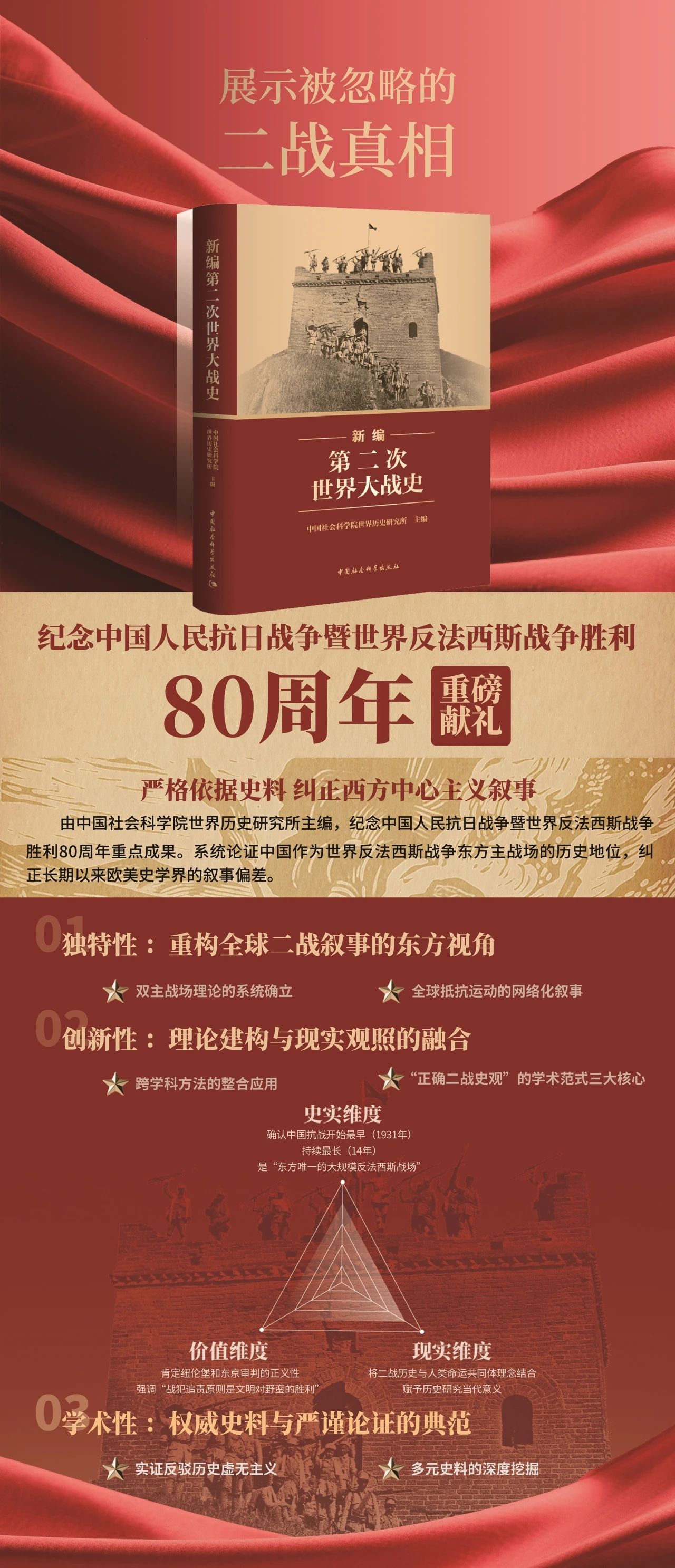 为纪念中国人民抗日战争暨世界反法西斯战争胜利80周年而作的《新编第二次世界大战史》一书由中国社会科学院世界历史研究所主编,中、英文版本目前已正式出版。该书考察从凡尔赛—华盛顿体系崩溃、战争爆发到法西斯投降、国际秩序重塑的历史进程,论述东方主战场、欧洲战场、太平洋战场、大西洋战场、北非地中海战场的作用以及诸战场之间的联动和配合,全景式呈现波澜壮阔的世界反法西斯战争的宏大画卷;强调全世界爱好和平的正义力量构建的反法西斯统一战线是战胜德意日法西斯的决定性因素,亚欧各国人民积极开展反法西斯运动,非洲、美洲和大洋洲人民全力支援反法西斯斗争,反法西斯盟国战略协作和互相支持,共同谱写了世界反法西斯战争的壮丽史诗;凸显中国人民抗日战争在世界反法西斯战争中的地位与贡献,展示中国共产党作为全民族抗战的中流砥柱的伟大形象。该书明确指出中国人民珍爱和平、坚定不移走和平发展道路,为构建人类命运共同体挺膺担当的崇高品格。